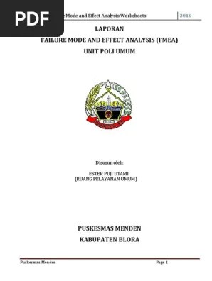 Fmea (failure mode effect analysis) puskesmas telaga. Laporan itu mengemukakan penelitian di rumah sakit di utah dan colorado serta new . Untuk download contoh dokumen akreditasi puskesmas/fktp disini! Fmea unit layanan farmasi puskesmas (contoh) failure mode . Cakupan fmea didefinisikan secara jelas sebagai berikut: